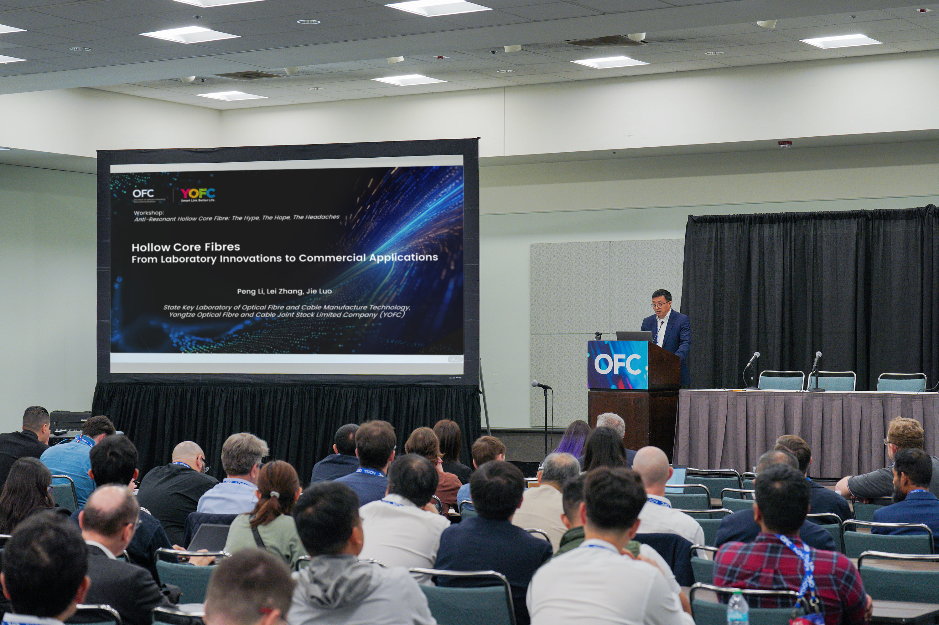 M. Luo a partagé les percées technologiques réalisées par YOFC en matière d’innovation structurelle des fibres à âme creux et de fabrication à grande échelle. Sur la base du record mondial de la plus faible atténuation de fibre optique, à 0,05 dB/km, annoncé lors de l’OFC l’an dernier, ce niveau a encore été abaissé à 0,04 dB/km, tandis que la longueur de tirage d’une fibre unique a été portée à 91,2 km, mettant en évidence les avancées continues de la technologie des fibres à âme creux ainsi que son immense potentiel de commercialisation. Le rapport a également présenté les progrès accomplis par YOFC dans le soudage des fibres à âme creux, les adaptateurs entre fibres à âme creux et fibres traditionnelles, les essais OTDR sur fibres à âme creux, ainsi que le déploiement de câbles à âme creux dans les applications d’ingénierie, offrant ainsi une présentation systématique des solutions apportées par YOFC aux défis rencontrés dans les projets de commercialisation des fibres à âme creux.